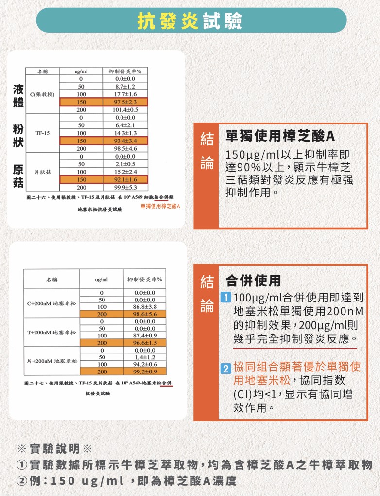 國際公開醫療研究皆指出,人類或動物長期使用類固醇藥物,會導致明顯依賴性,並伴隨大量副作用造成肝腎負擔。而牛樟芝具備保護肝腎的特性,透過實驗進一步發現,在特定的活性化合物-樟芝酸A、B、C、H、K中,樟芝酸A唯一成功進入細胞核發揮作用,具有等同類固醇抗發炎特性。